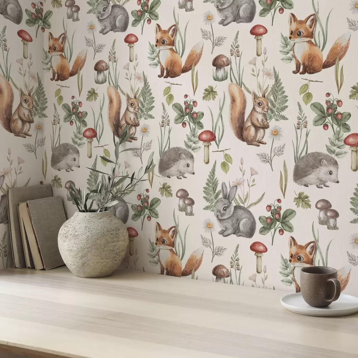 Tapete Waldtiere, Pilze und Pflanzen in märchenhaftem Stil Nr. a00477
