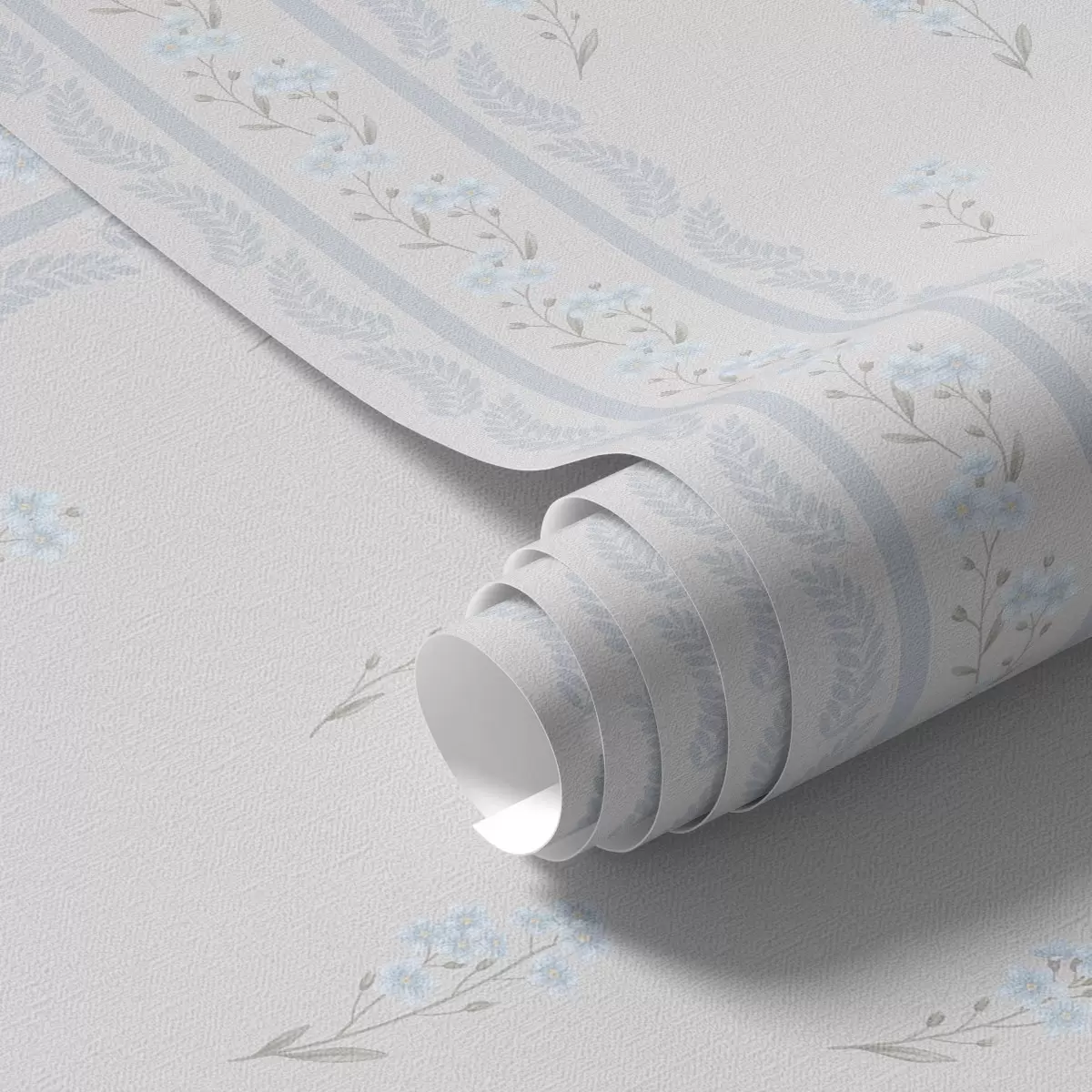 Tapete Weißer Hintergrund mit blauen Blumen und Zierstreifen Nr. a00484v1