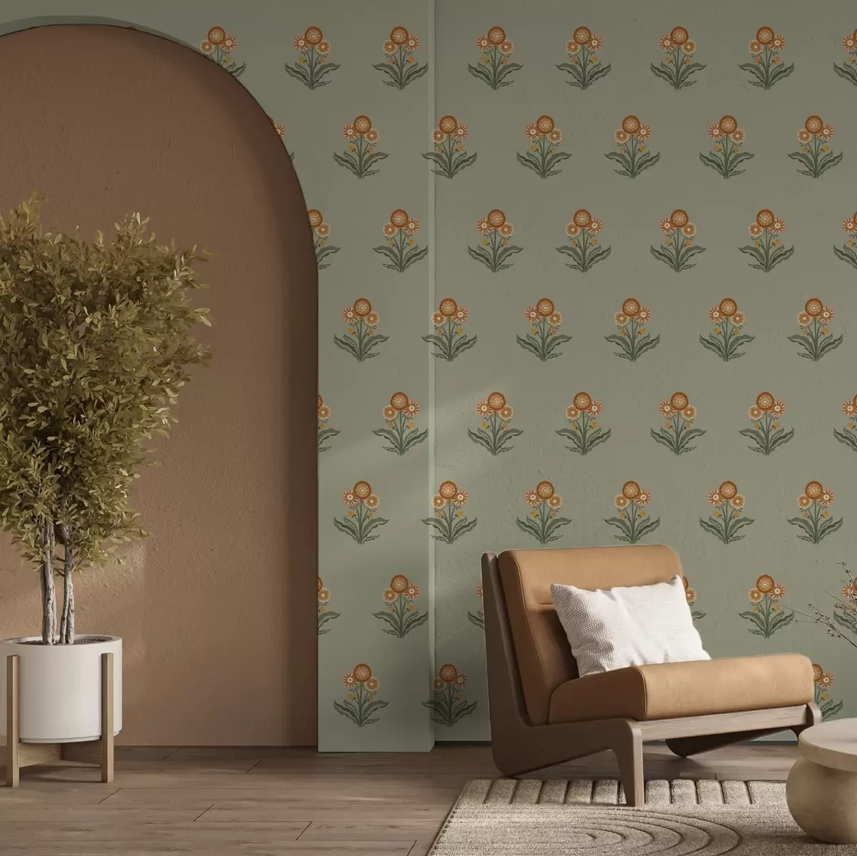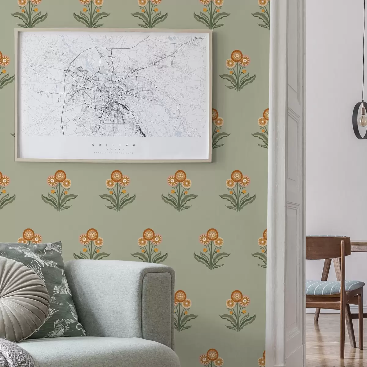 Tapete Stilisierte Blumen auf olivfarbenem Hintergrund, warme Farbtöne Nr. a00494v2