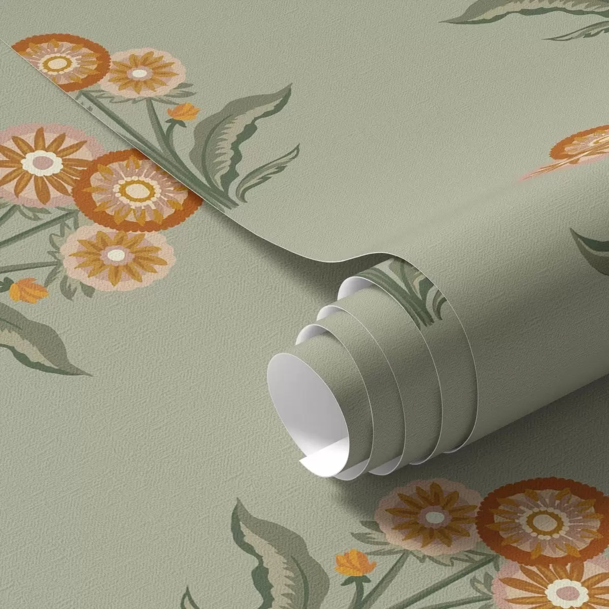 Tapete Stilisierte Blumen auf olivfarbenem Hintergrund, warme Farbtöne Nr. a00494v2