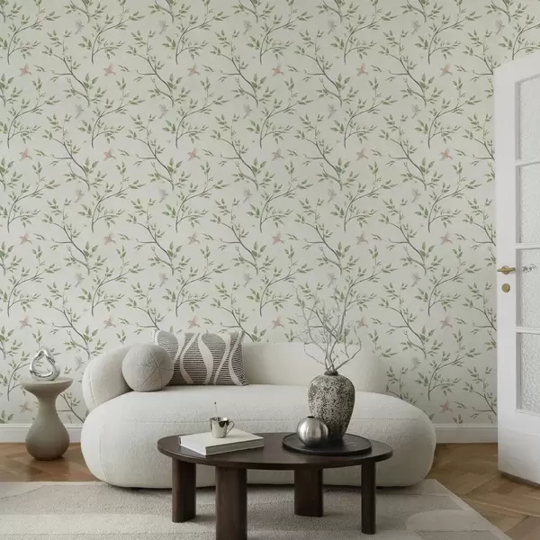 Tapete Aquarellzweige mit Blättern und Vögeln auf hellem Hintergrund Nr. a00496