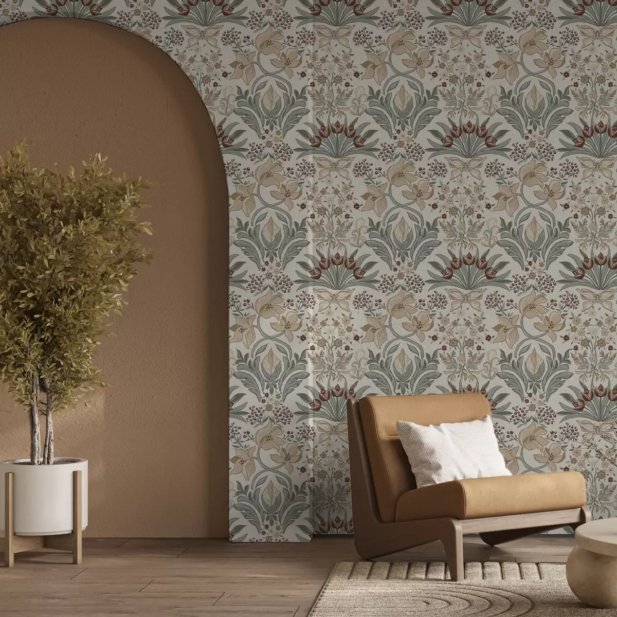 Tapete Dekorative Lilien und ein Schmetterling auf cremefarbenem Hintergrund Nr. a00500
