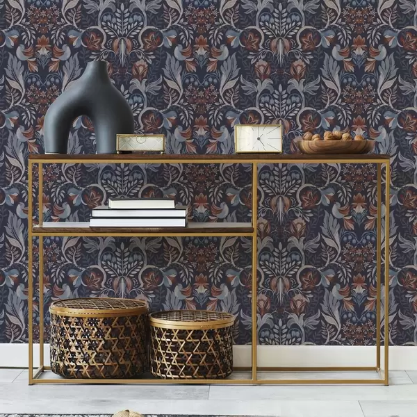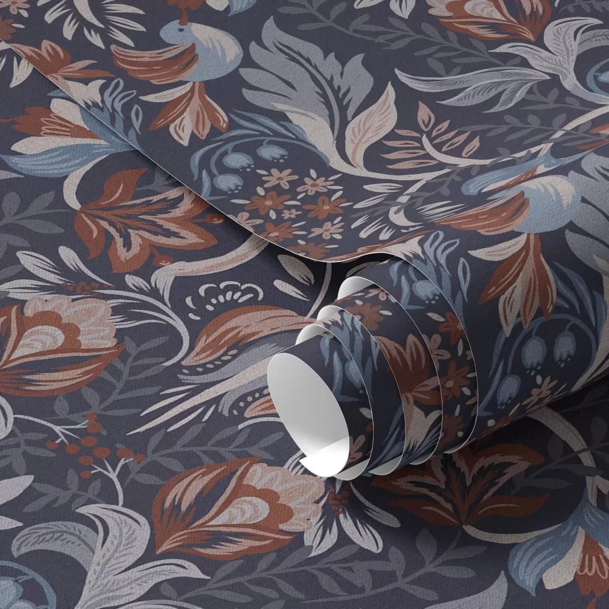 Tapete Volksblumen und Vögel auf dunkelblauem Hintergrund Nr. a00502