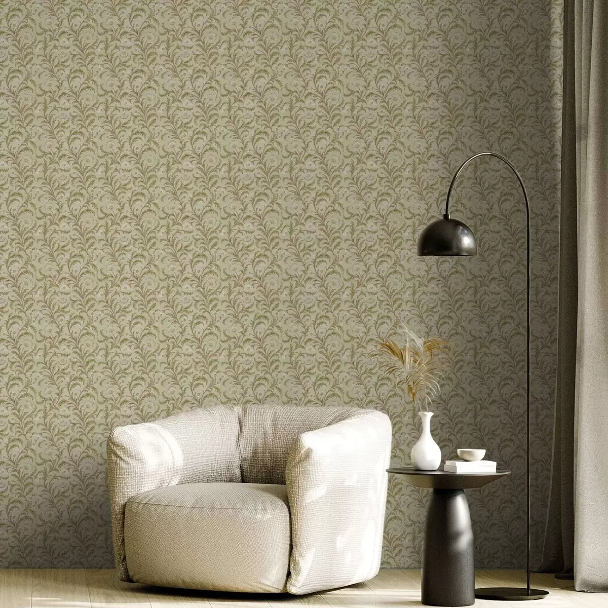Tapete Vintage-Ornament mit Schnörkeln und Blumen, beige und olivgrün Nr. a00574