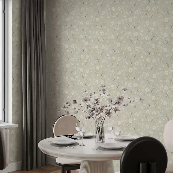 Tapete Vögel zwischen weißen Blüten auf grau-grünem Hintergrund Nr. a00583