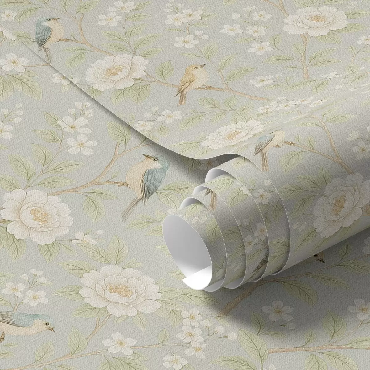 Tapete Vögel zwischen weißen Blüten auf grau-grünem Hintergrund Nr. a00583