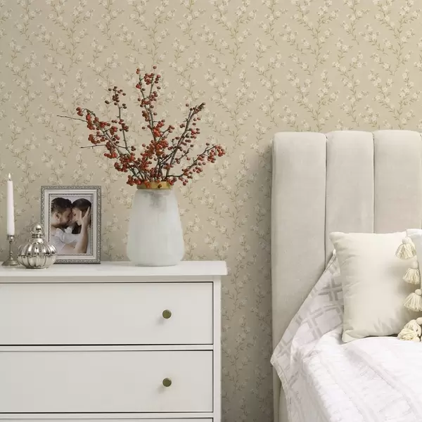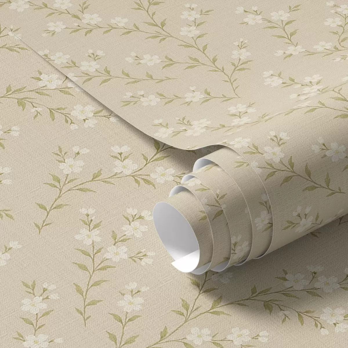 Tapete Kleine weiße Zweige auf beigem Leinenhintergrund Nr. a00584