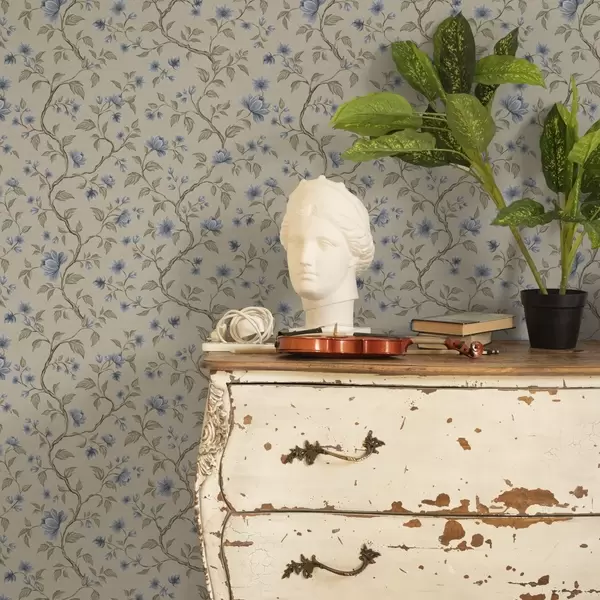 Tapete Blaue blühende Zweige auf einem beigefarbenen Leinenhintergrund Nr. a00590