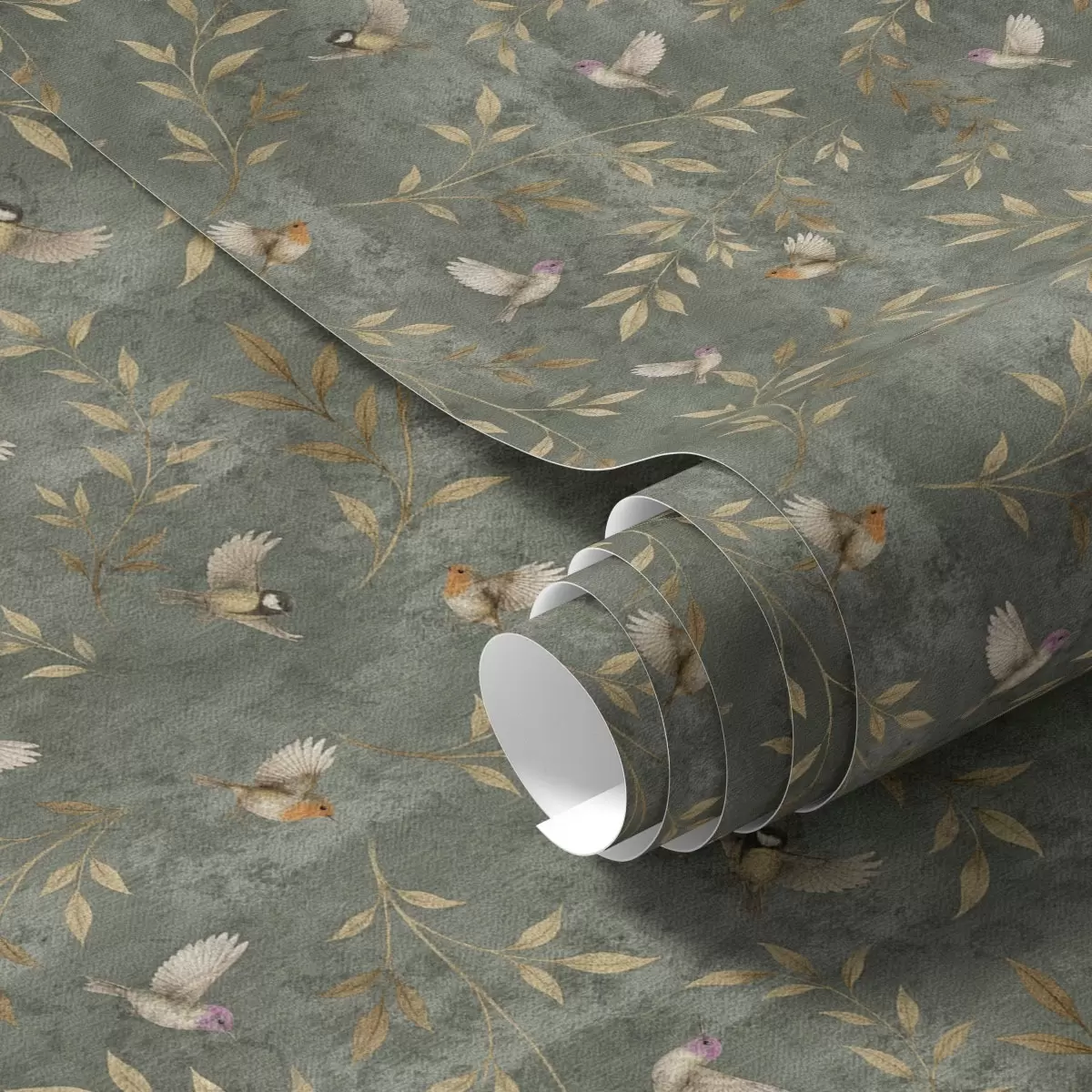 Tapete Vögel in orangefarbenem Laub vor tiefgrünem Hintergrund Nr. a00591