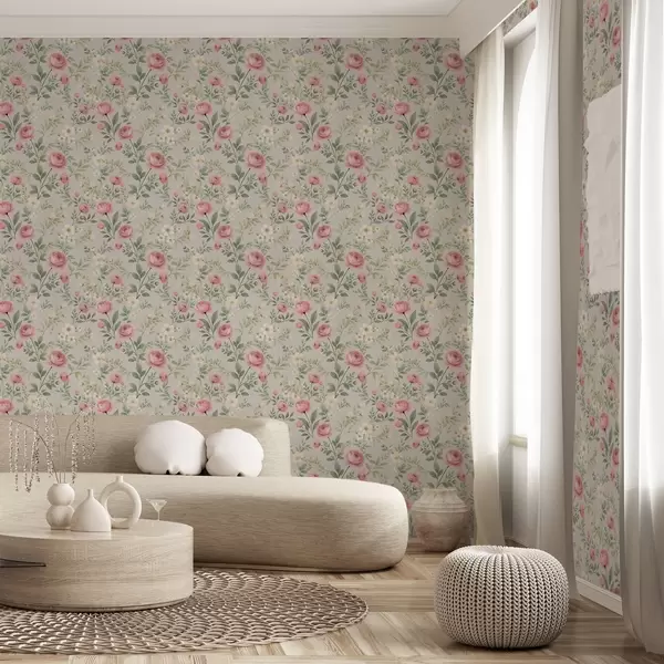 Tapete Aquarell-Pfingstrosen und weiße Blumen auf grau-beigem Hintergrund Nr. a00592