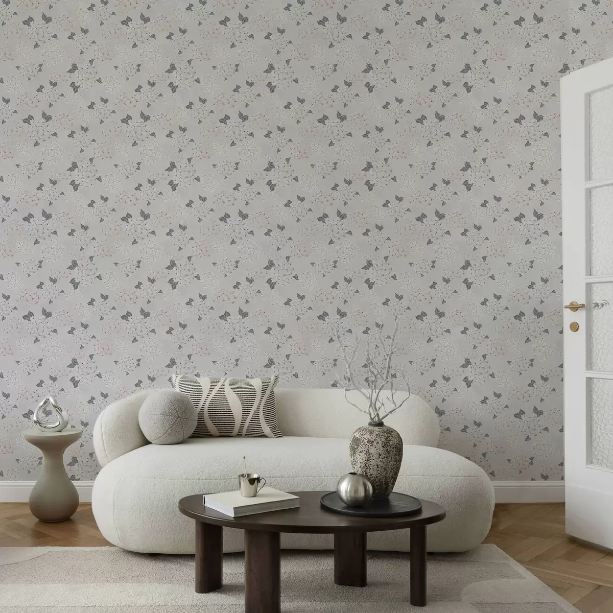 Tapete Luftige Blüten auf hellem Hintergrund, zarte rosa-graue Farbtöne Nr. a00600