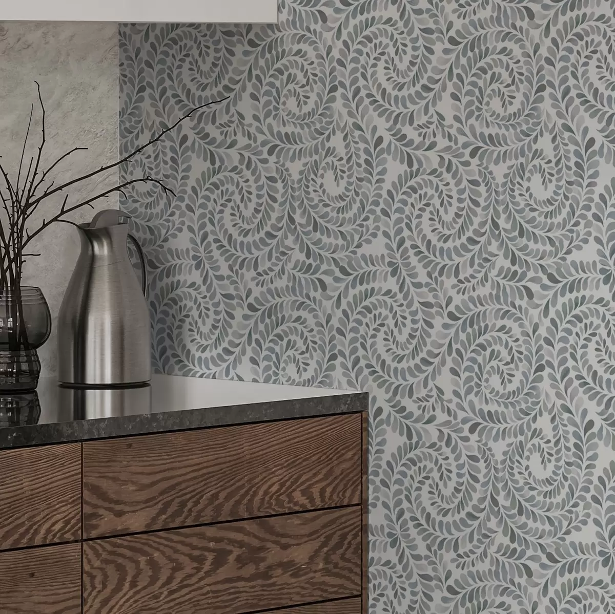 Tapete Blattartige Spiralen in kühlen Graublau-Tönen Nr. a00602v1
