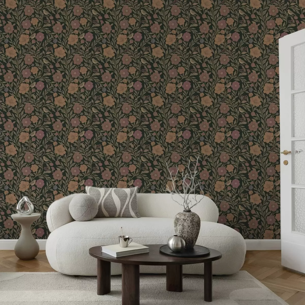 Tapete Herbstblumen und Vögel auf tiefem smaragdgrünem Hintergrund Nr. a00605v1