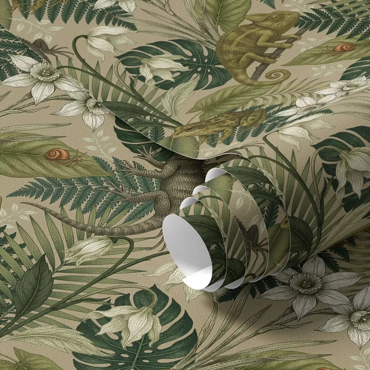 Tapete Chamäleons und tropische Blätter, weiße Blumen, beiger Hintergrund Nr. a00608