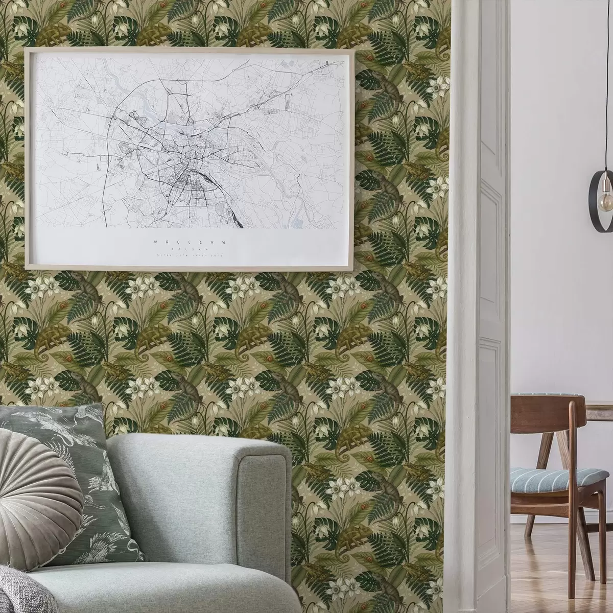 Tapete Chamäleons und tropische Blätter, weiße Blumen, beiger Hintergrund Nr. a00608