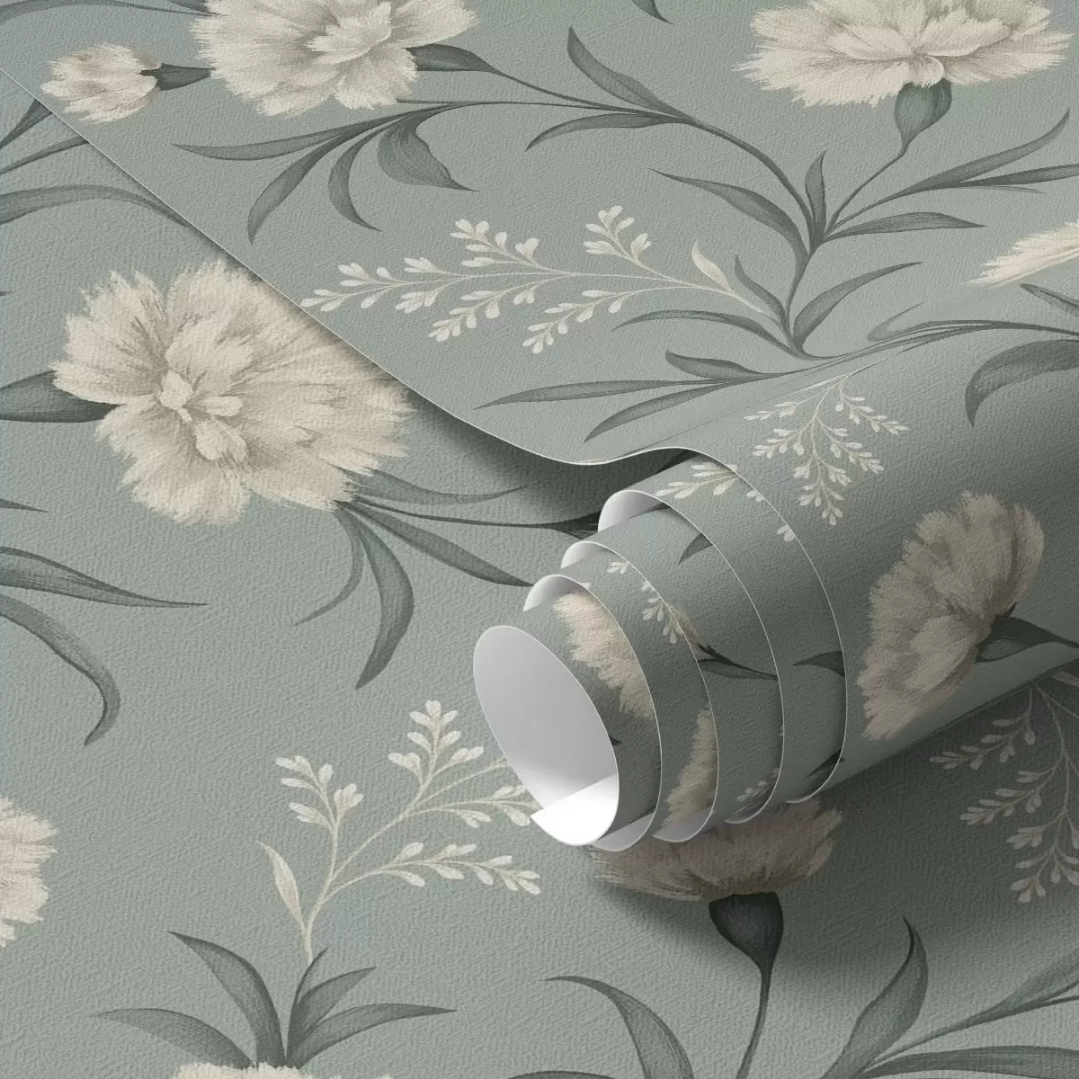 Tapete Pudrige Nelken auf grau-blaugrünem Hintergrund, raffinierter Druck Nr. a00610