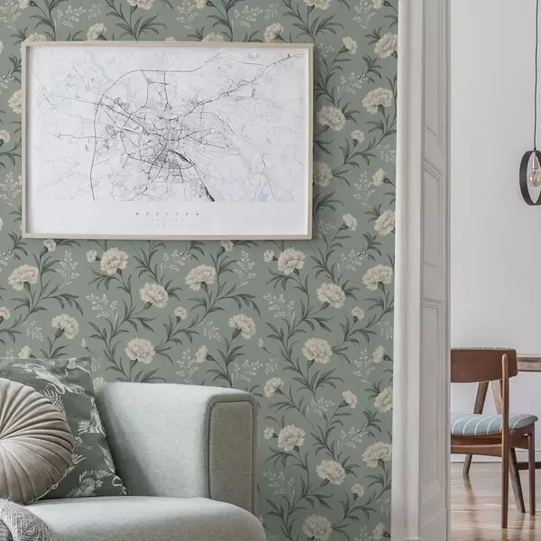 Tapete Pudrige Nelken auf grau-blaugrünem Hintergrund, raffinierter Druck Nr. a00610