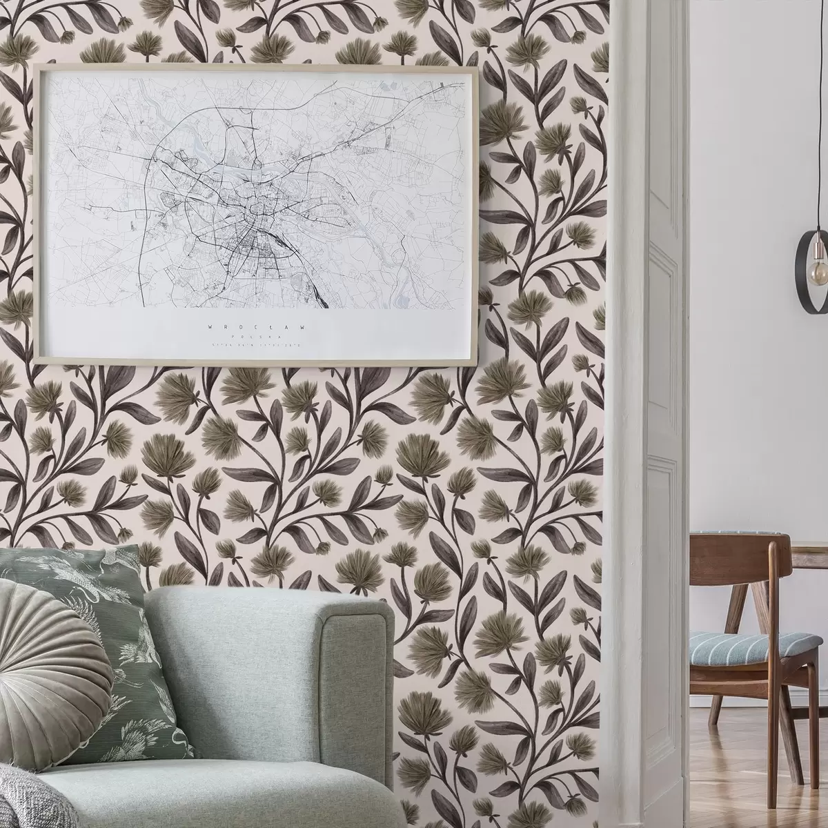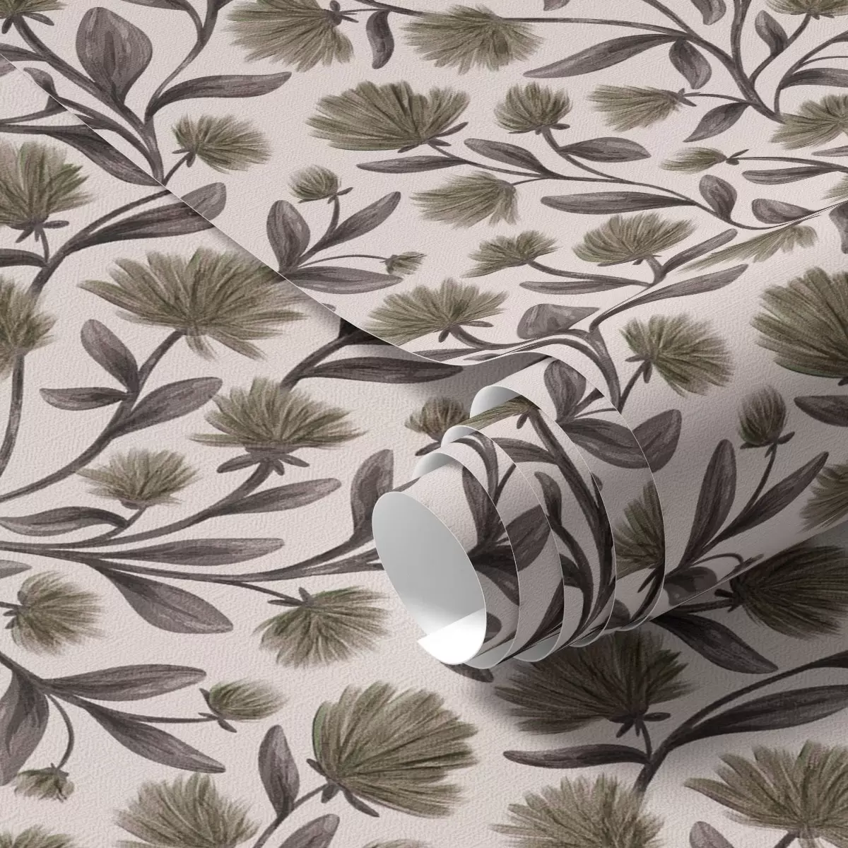 Tapete Wildblumen in Grau-Oliv-Tönen auf cremefarbenem Hintergrund Nr. a00623v1