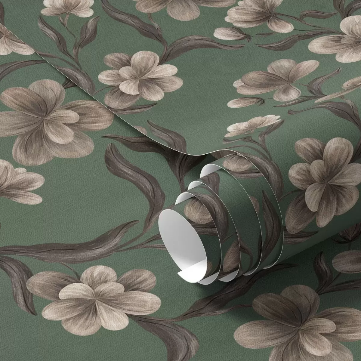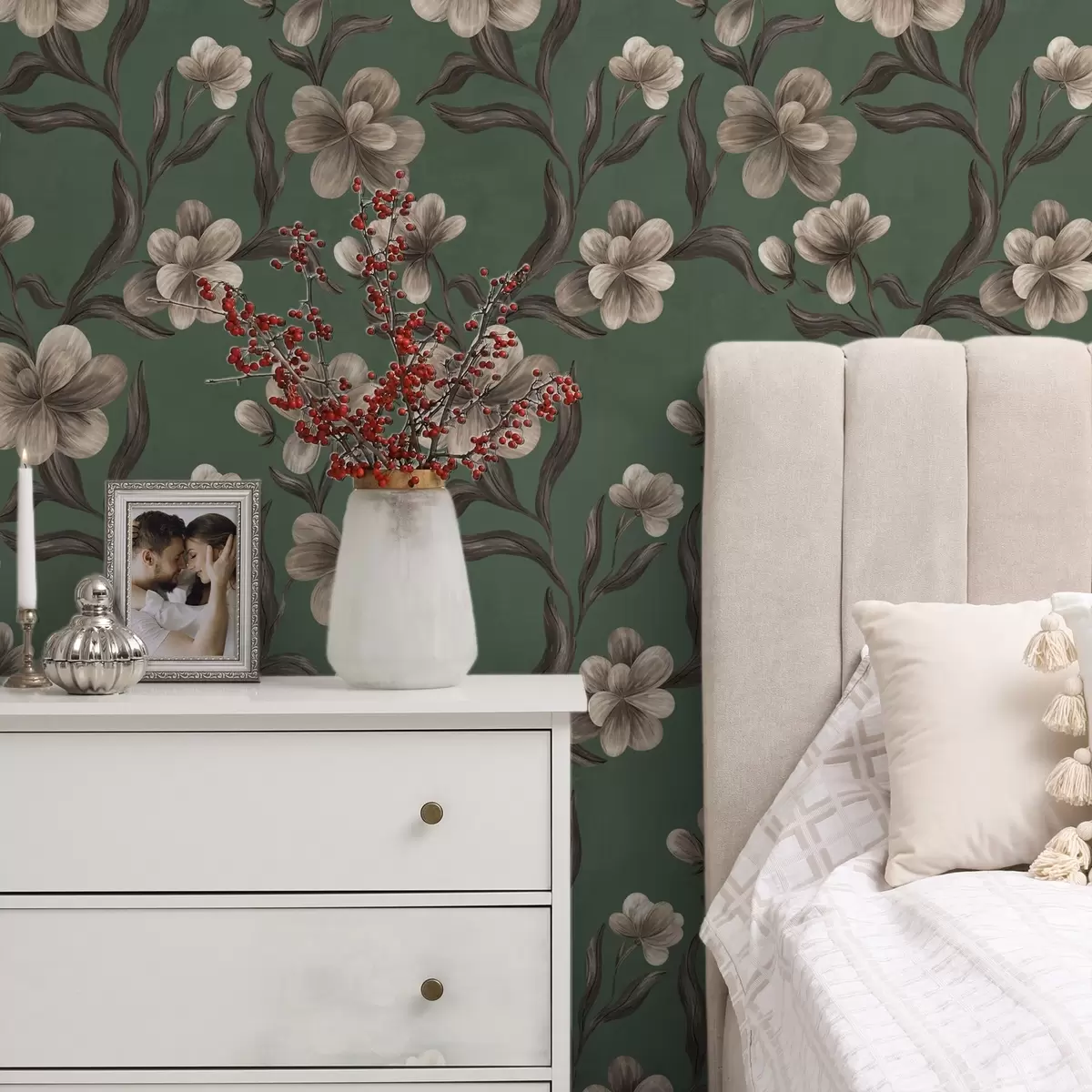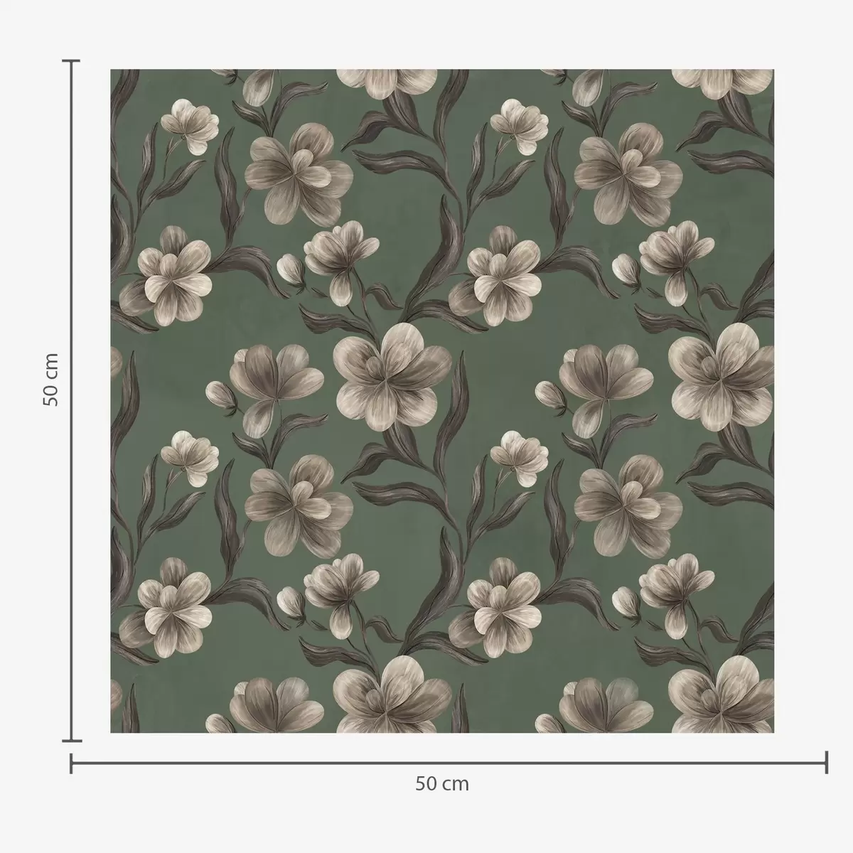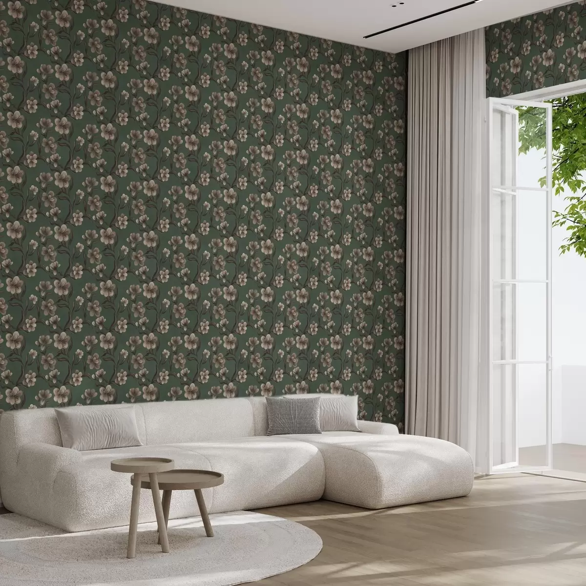 Tapete Beigefarbene Blumen auf sattgrünem Hintergrund Nr. a00626v3