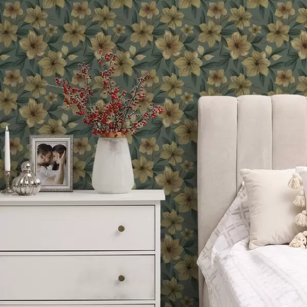 Tapete Ockerfarbene Blumen auf tiefgrünem Hintergrund, dichtes Muster Nr. a00628