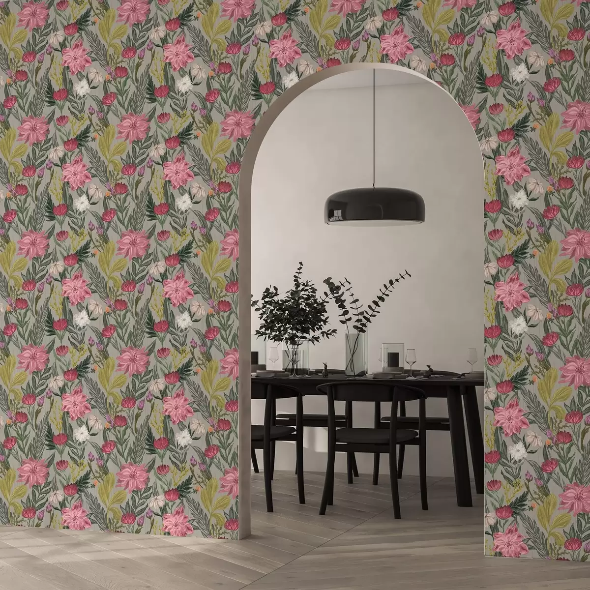 Tapete Üppige rosa und cremefarbene Blumen auf grauem Hintergrund, pastose Textur Nr. a00629