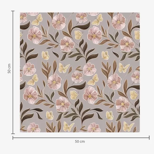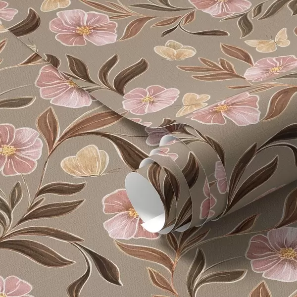 Tapete Rosa Blumen und Schmetterlinge auf olivbeigem Hintergrund Nr. a00633v2