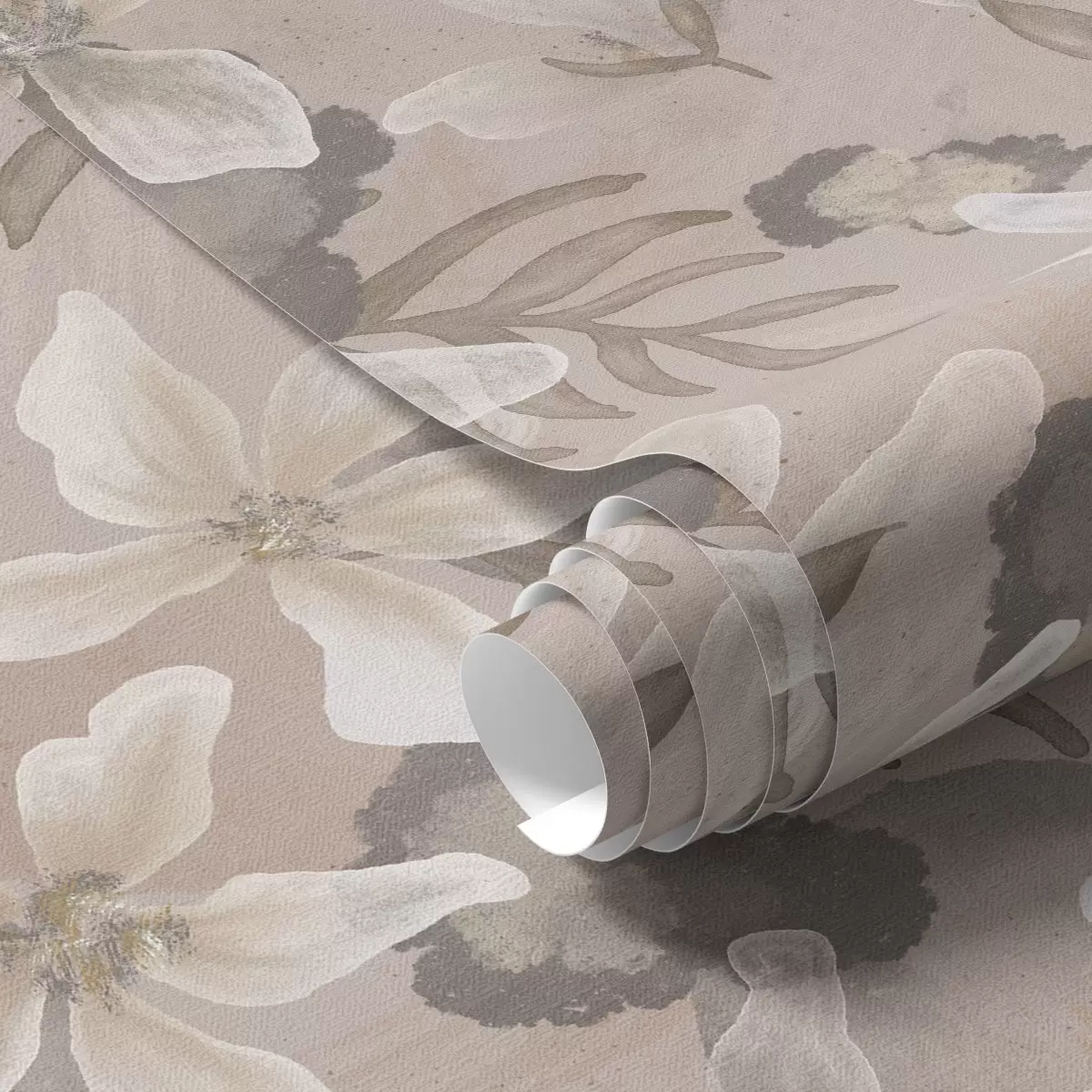 Tapete Große beigefarbene Blumen mit abstrakten Wasserfarbenflecken Nr. a00635