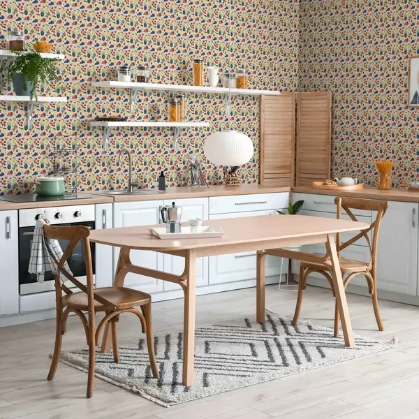 Tapete Lebhaftes Muster mit Früchten, Zweigen und Vasen Nr. a00637