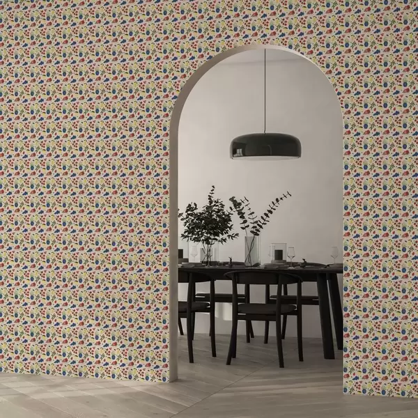 Tapete Lebhaftes Muster mit Früchten, Zweigen und Vasen Nr. a00637