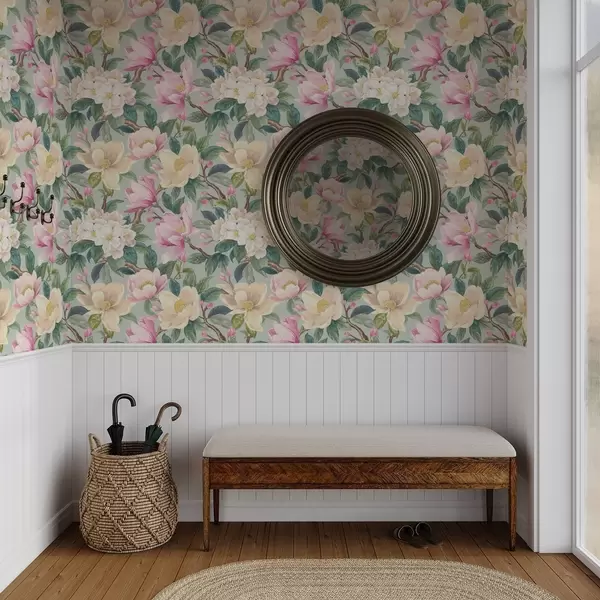 Tapete Magnolien und weiße Blüten auf mintgrauem Hintergrund Nr. a00644