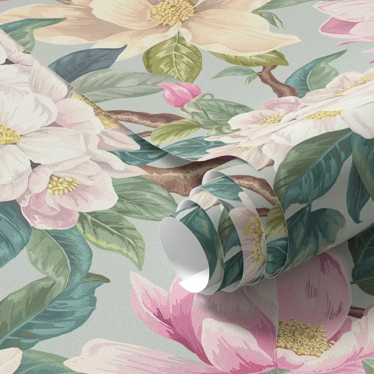 Tapete Magnolien und weiße Blüten auf mintgrauem Hintergrund Nr. a00644