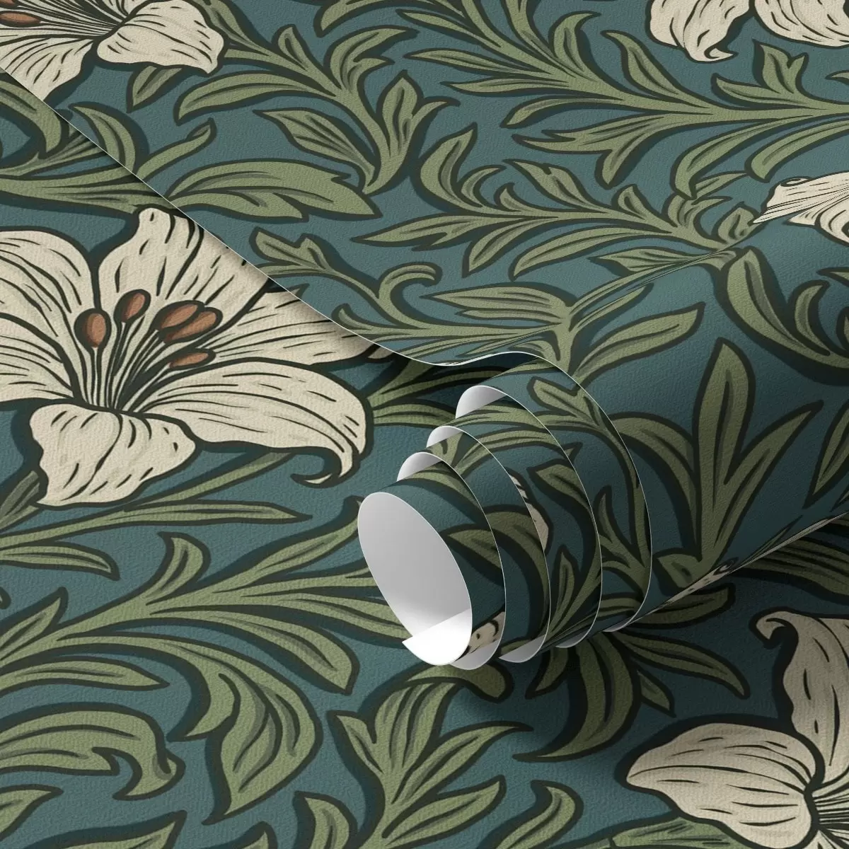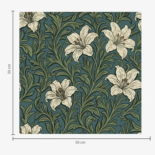 Tapete Cremefarbene Lilien inmitten von dichtem Grün auf türkisfarbenem Hintergrund Nr. a00645