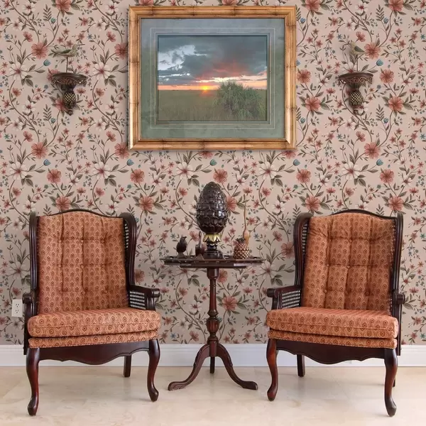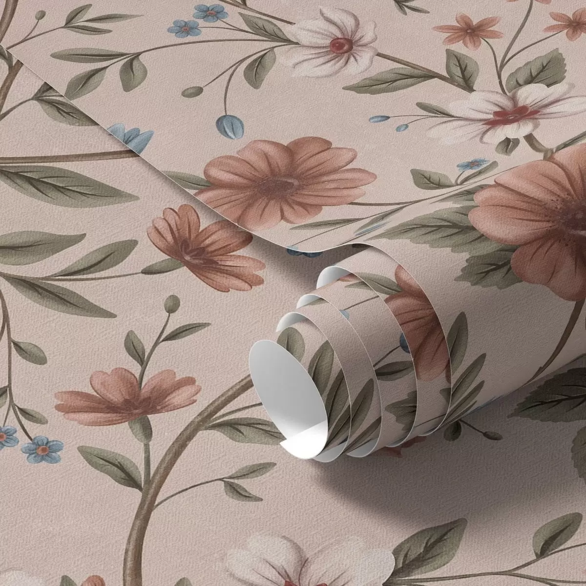 Tapete Rosa-korallenrote Blüten und Blätter auf altrosa Hintergrund Nr. a00667