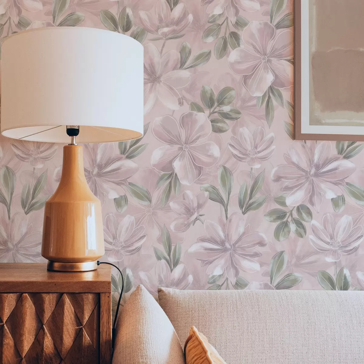 Tapete Rosa Blüten mit zarten Blättern auf einem sanften Hintergrund Nr. a00675