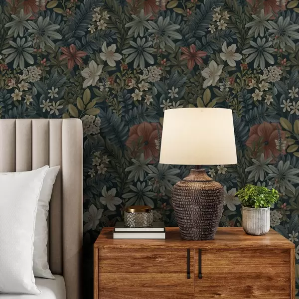 Tapete Dunkler Hintergrund mit dichten Blumen und Blättern in warmen Farbtönen Nr. a00678