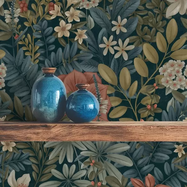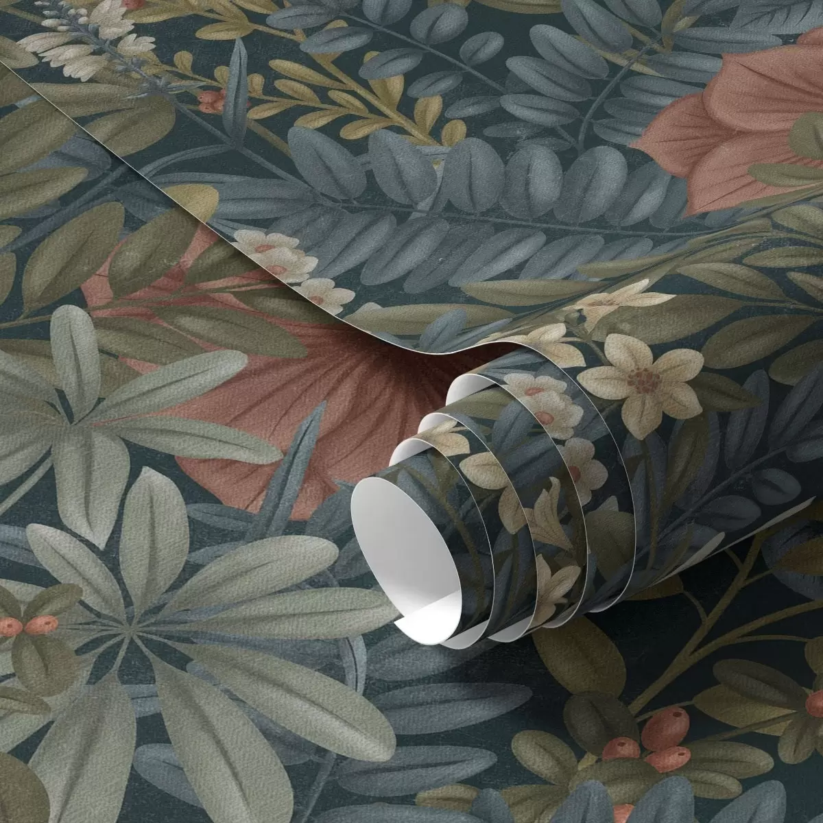 Tapete Dunkler Hintergrund mit dichten Blumen und Blättern in warmen Farbtönen Nr. a00678