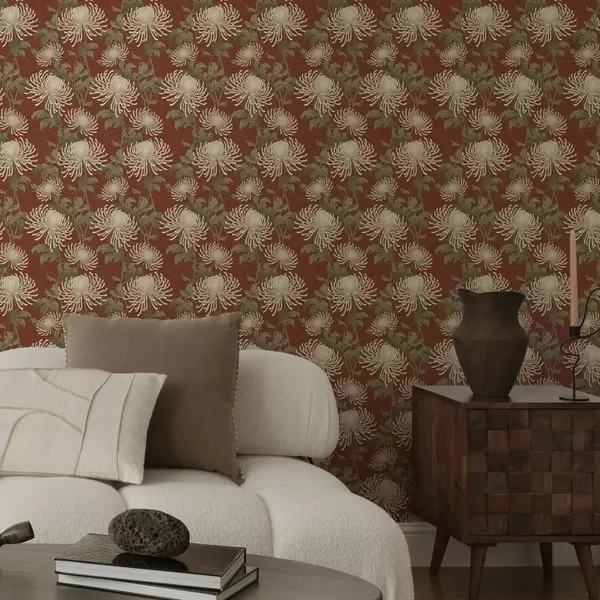 Tapete Cremefarbene Chrysanthemen auf terrakottafarbenem Hintergrund, asiatischer Stil Nr. a00693