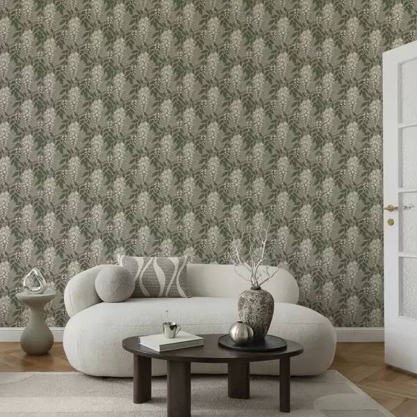 Tapete Helle Glyzinien auf grau-olivfarbenem Hintergrund, herabfallende Trauben Nr. a00694