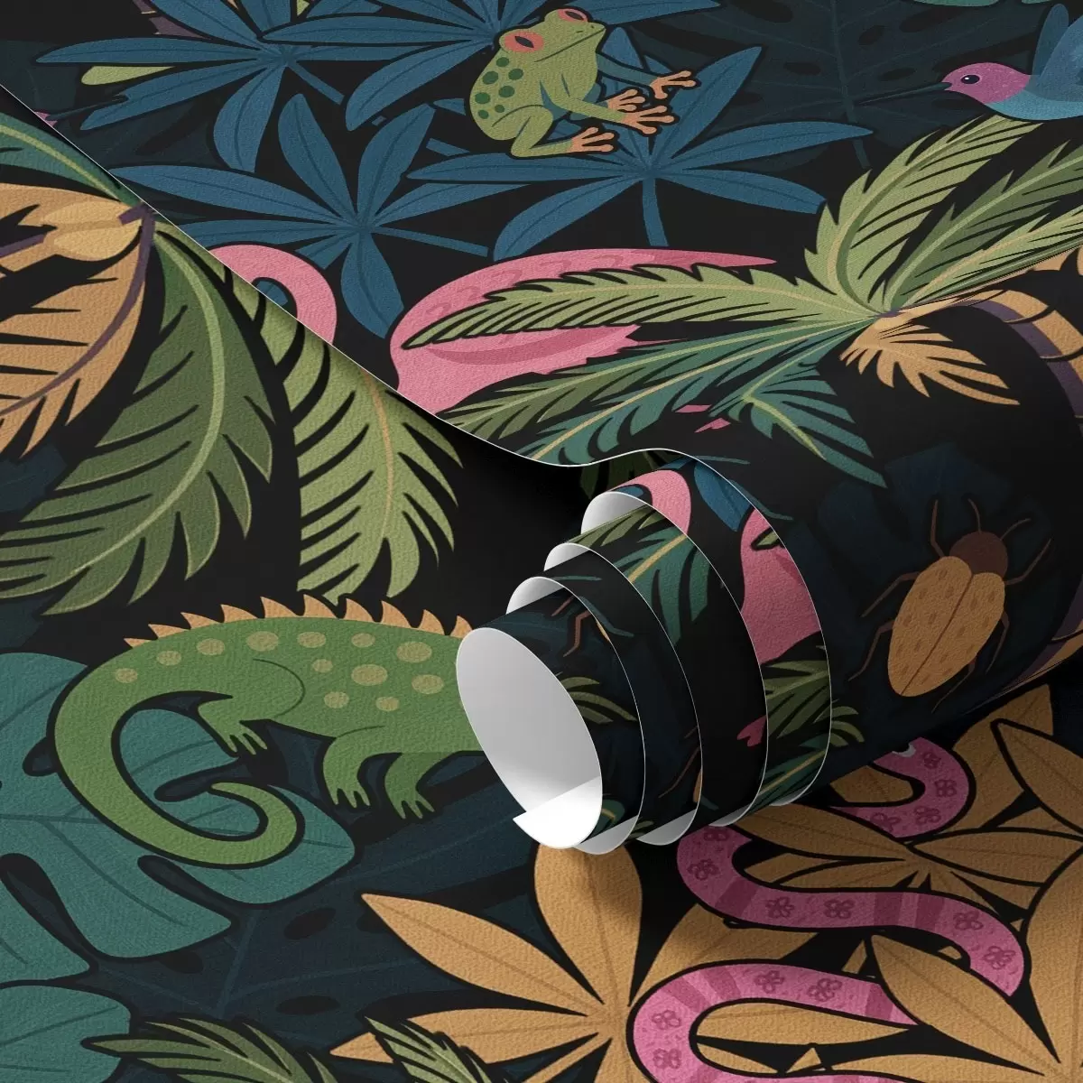 Tapete Leuchtende tropische Tiere zwischen Blättern auf dunklem Hintergrund Nr. a00701