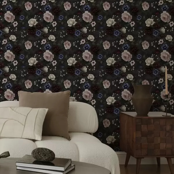 Tapete Dunkle Rosen, Anemonen und Pfingstrosen vor einem dunklen Hintergrund Nr. a00704