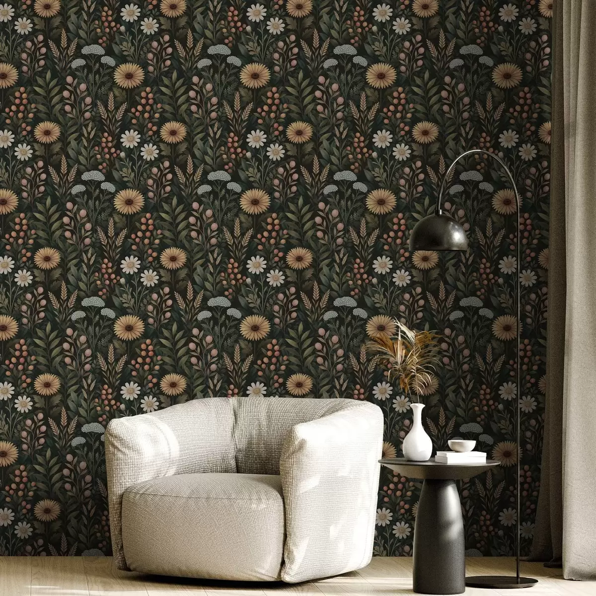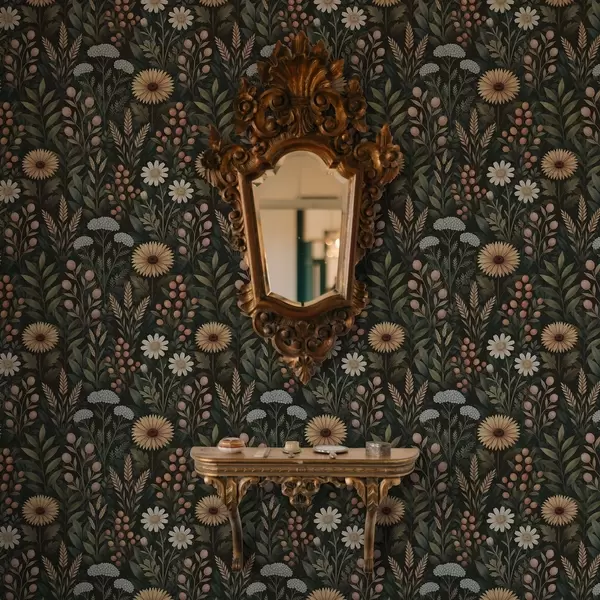 Tapete Wildblumen und Beeren auf dunklem Hintergrund, natürliches Ornament Nr. a00707