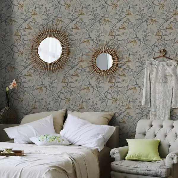 Tapete Vintage-Blumen mit blauem Laub auf cremefarbenem Hintergrund Nr. a00717