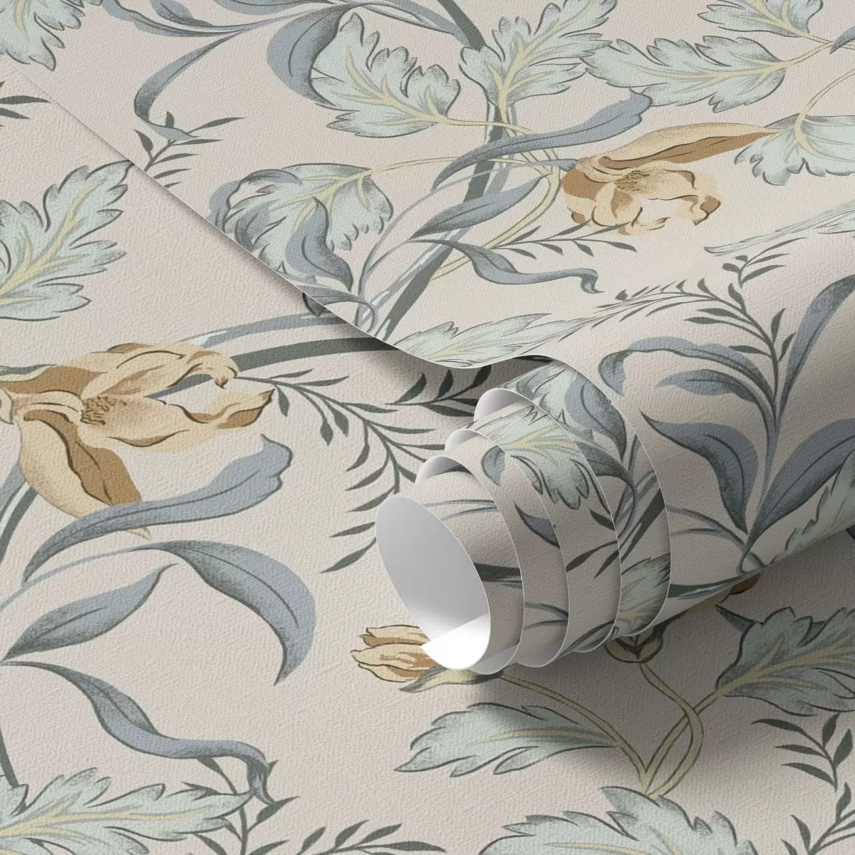 Tapete Vintage-Blumen mit blauem Laub auf cremefarbenem Hintergrund Nr. a00717