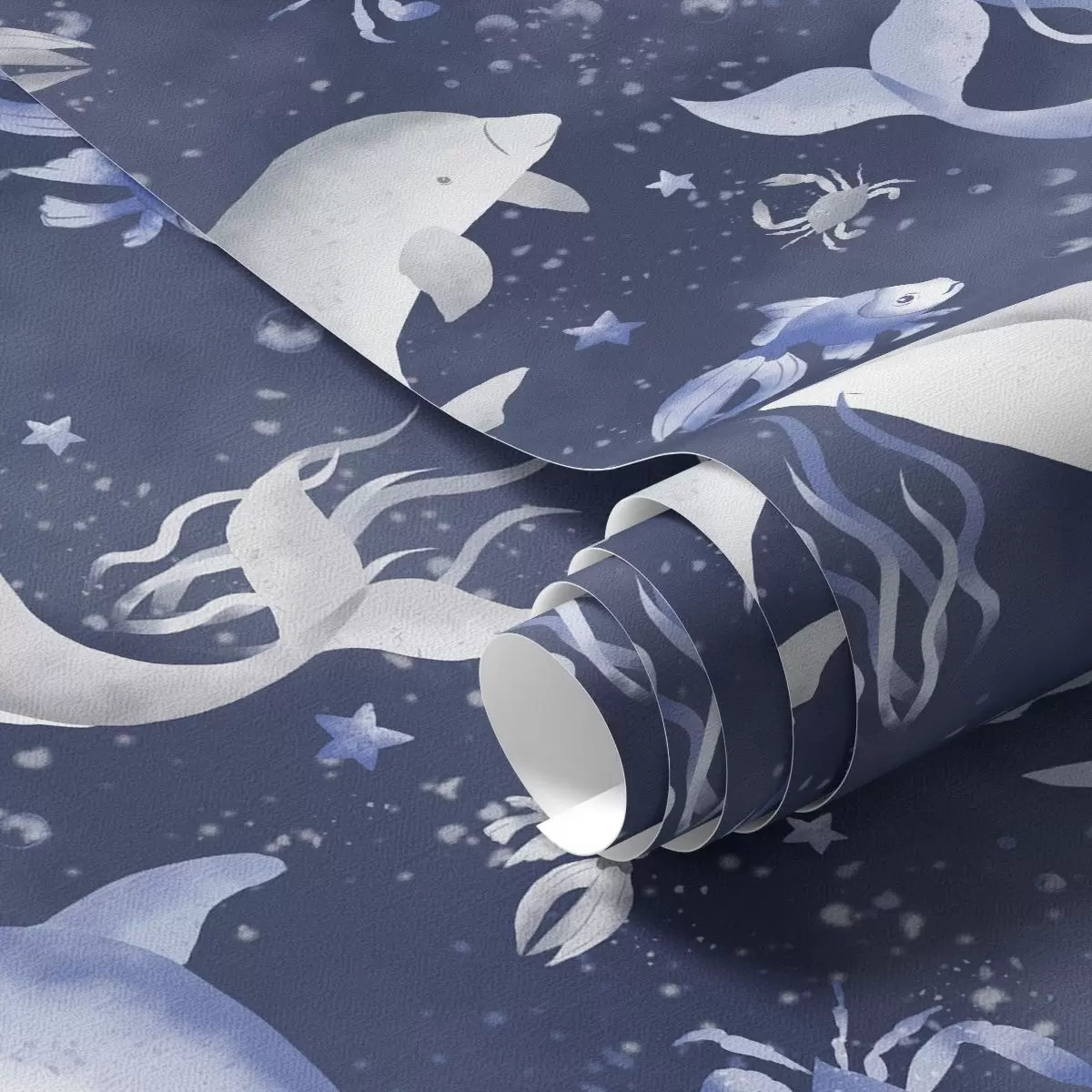 Tapete Wale, Delfine und Krabben auf dunkelblauem Hintergrund Nr. a00720