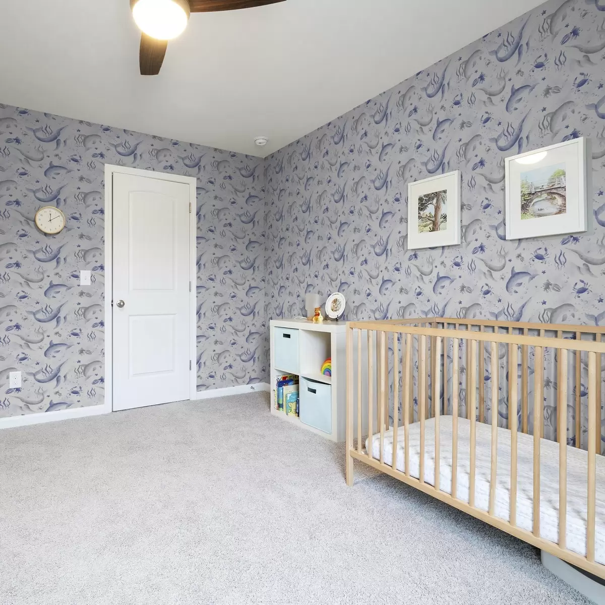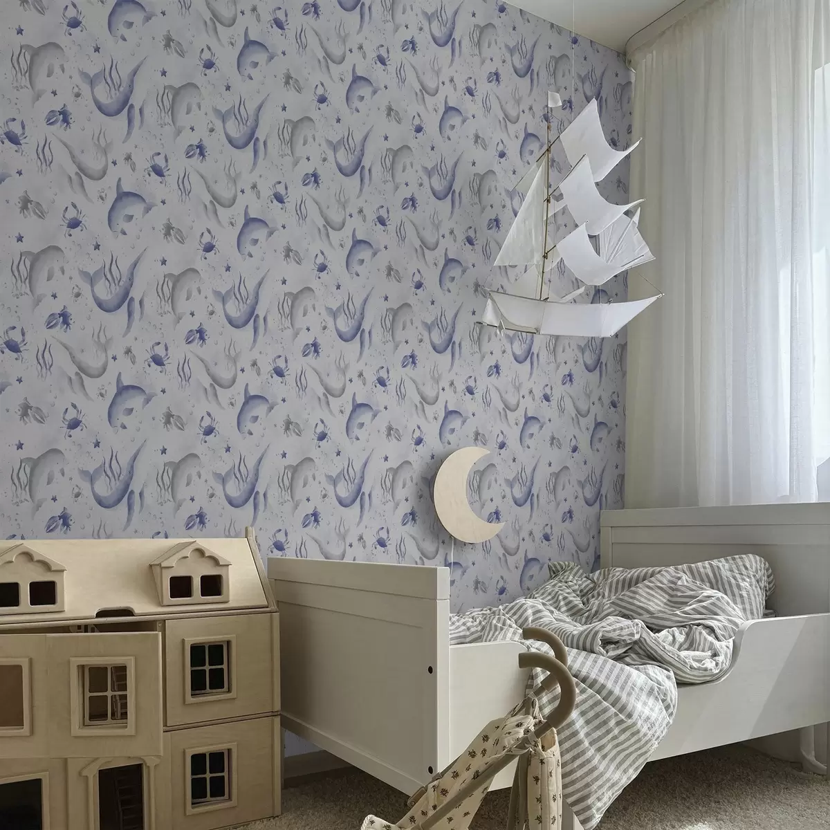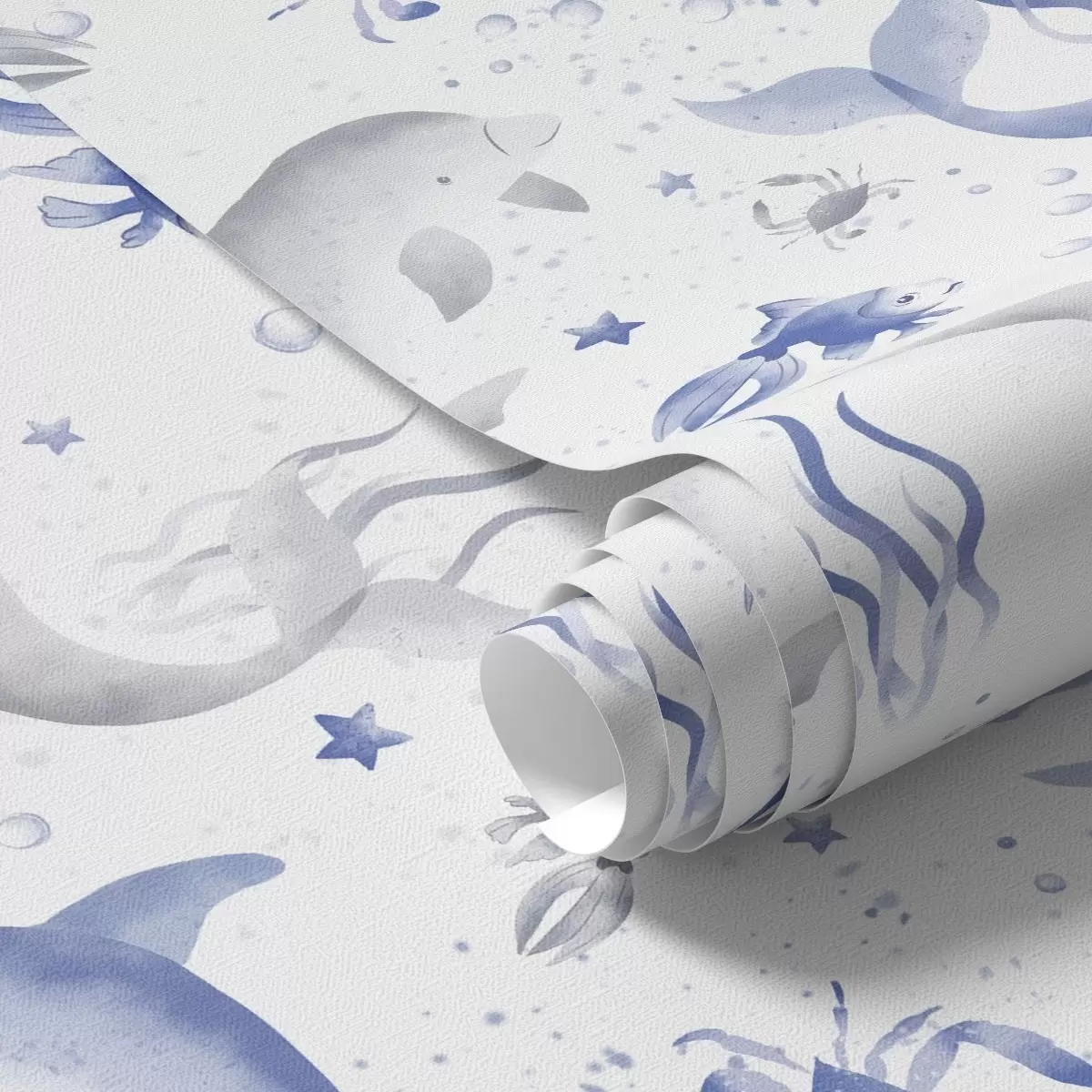 Tapete See-Wale und Delfine in Blautönen auf weißem Hintergrund Nr. a00720v1