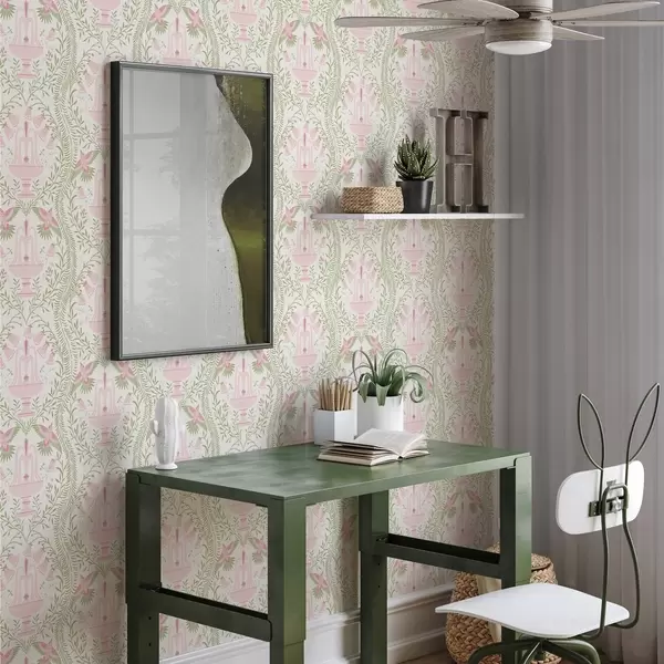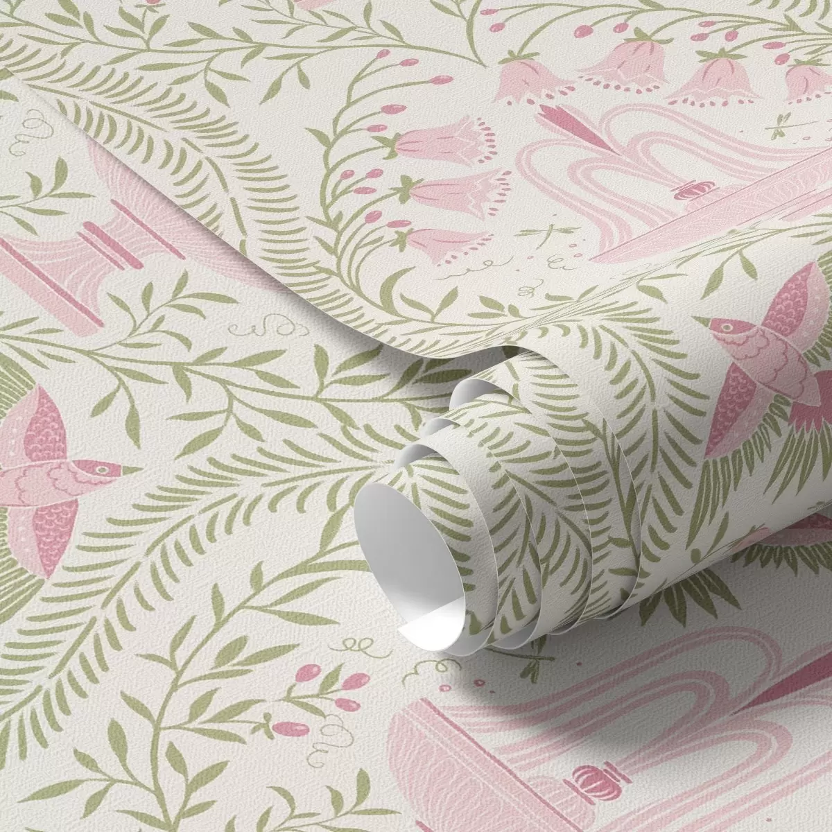 Tapete Brunnen, Kolibris und grüne Schriftrollen auf hellem Hintergrund Nr. a00723
