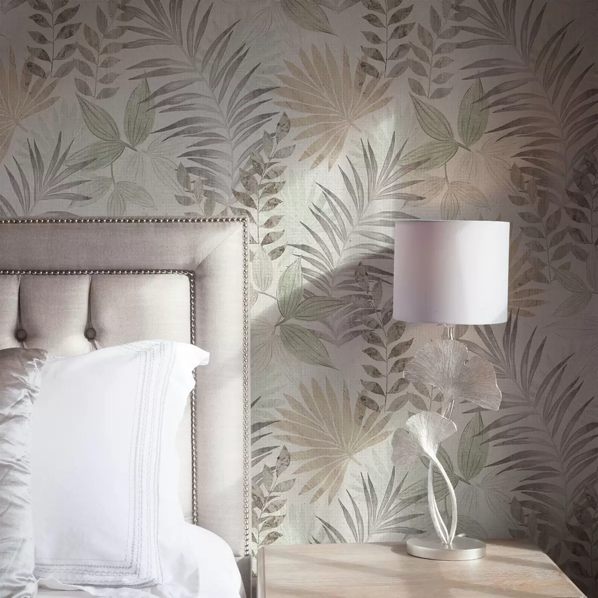 Tapete Pastellfarbene tropische Blätter auf hellem Hintergrund, dezente Textur Nr. a00725
