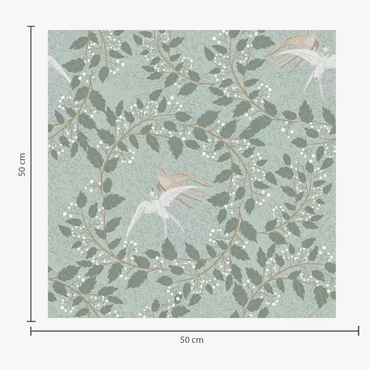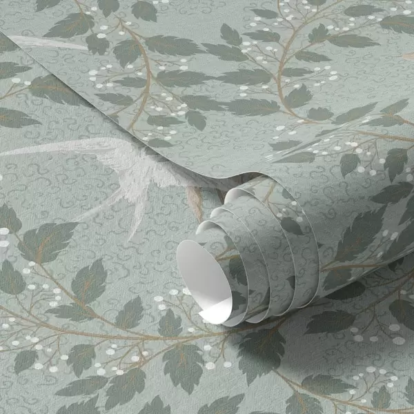 Tapete Zweige mit weißen Beeren und Vögeln auf grünem Hintergrund Nr. a00731