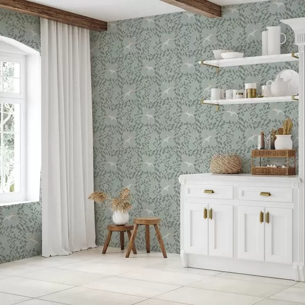 Tapete Zweige mit weißen Beeren und Vögeln auf grünem Hintergrund Nr. a00731