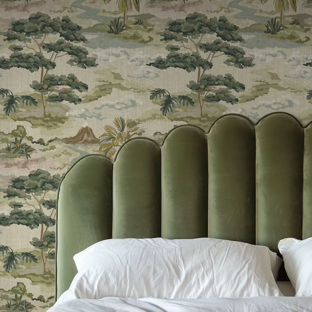 Tapete Landschaft mit Fluss, Bäumen und Palmen in sanften Farbtönen Nr. a00736